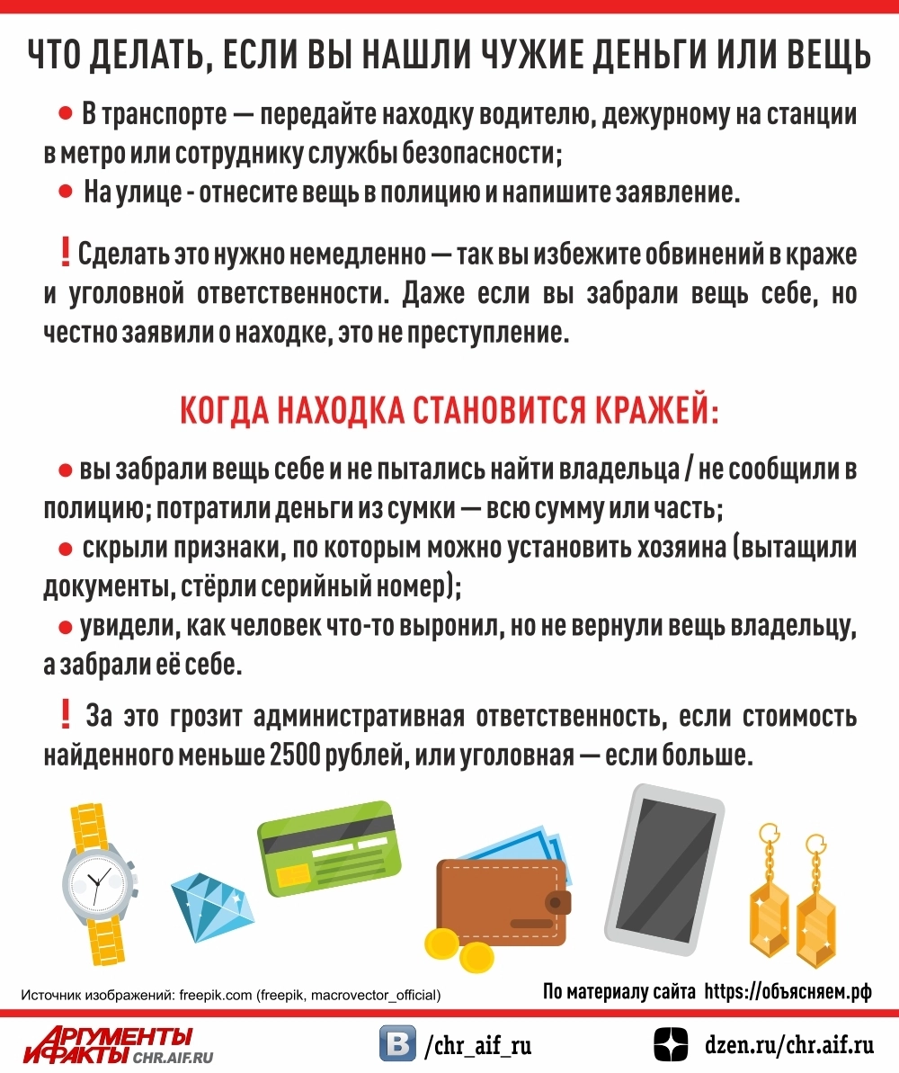 Что делать, если вы нашли чужие деньги или вещь? Инфографика