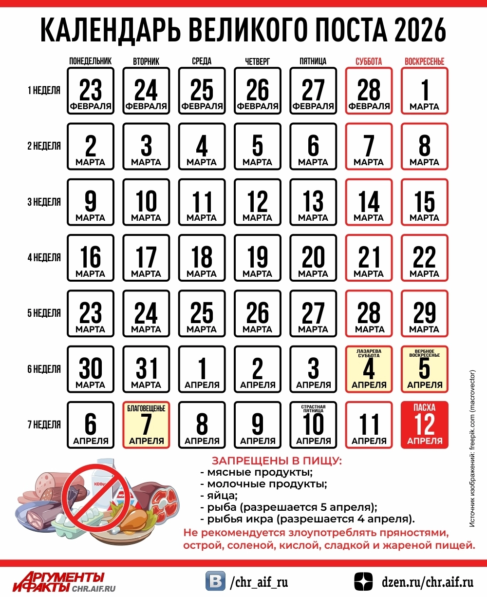 В 2026 году Великий пост продлится с 23 февраля по 12 апреля. От каких продуктов верующим нужно отказаться и в какие дни разрешена рыба — в инфографике «АиФ».
