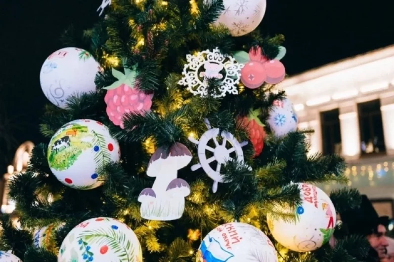 Она стала настоящей энциклопедией района: на ветвях разместились декоративные штурвалы и якоря, напоминающие о местной судостроительной истории, игрушки в виде грибов, ягод, яркие шары с изображением окороков и сала — отсылка к традиционным промыслам и знаменитому фестивалю «Доброе сало». А цветовая гамма — золотой, красный и синий — повторяет цвета герба муниципалитета.