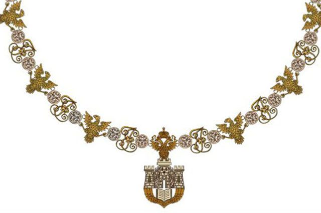 Цепь состоит из 54 звеньев трех видов: фигуры золотого одноглавого орла, вензеля императрицы Екатерины Великой и оберега древних обитателей здешних мест вятичей.