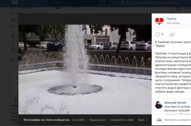 В тамбовских фонтанах хулиганы вспенили воду. Шутники добавили в воду средство для мытья посуды и создали дополнительные проблемы тем, кот отвечает за содержание фонтанов.