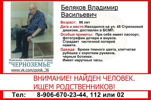 Волонтеры поисково-спасательного отряда «Черноземье» ищут родственников 86-летнего Владимира Белякова.